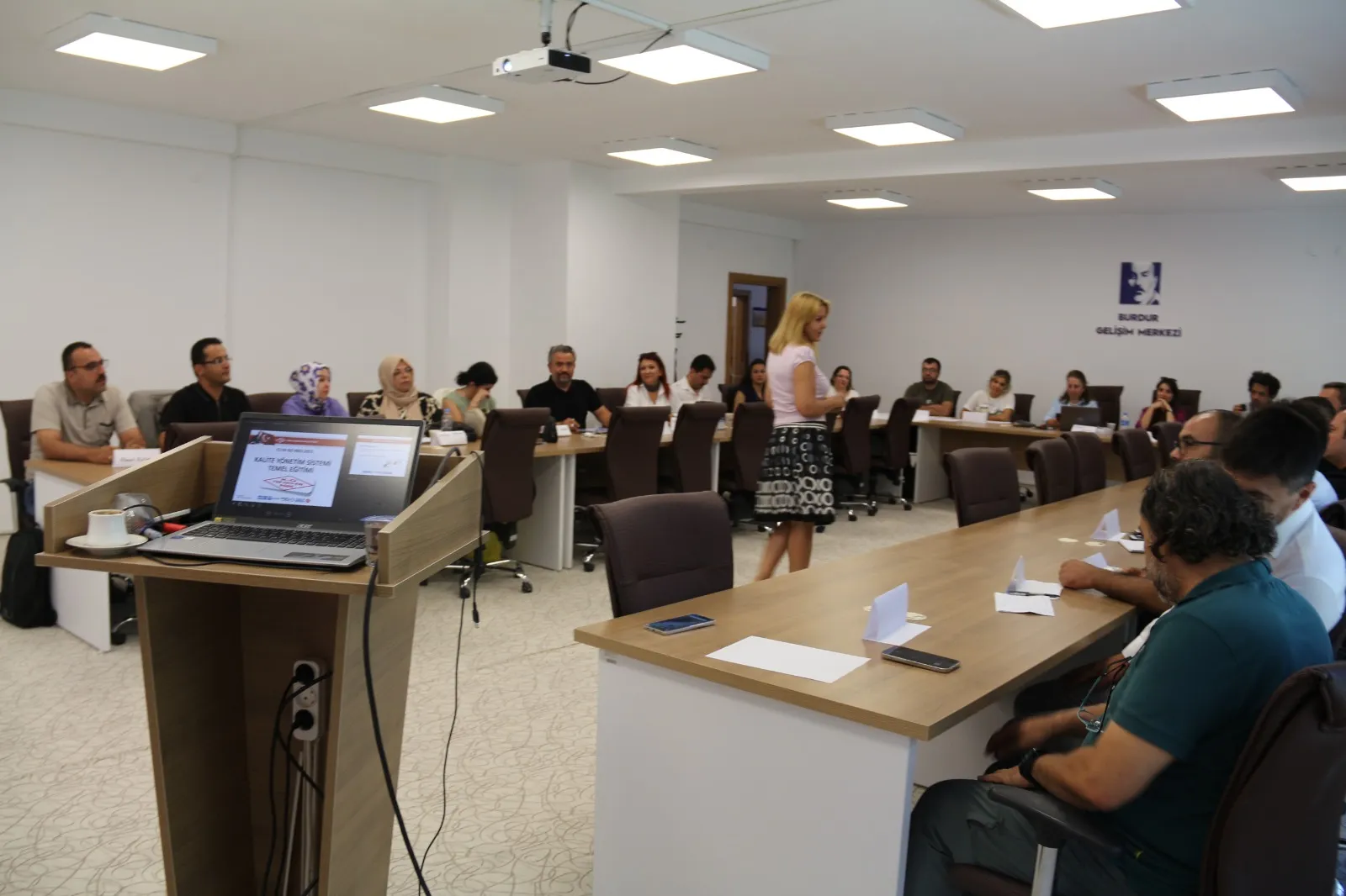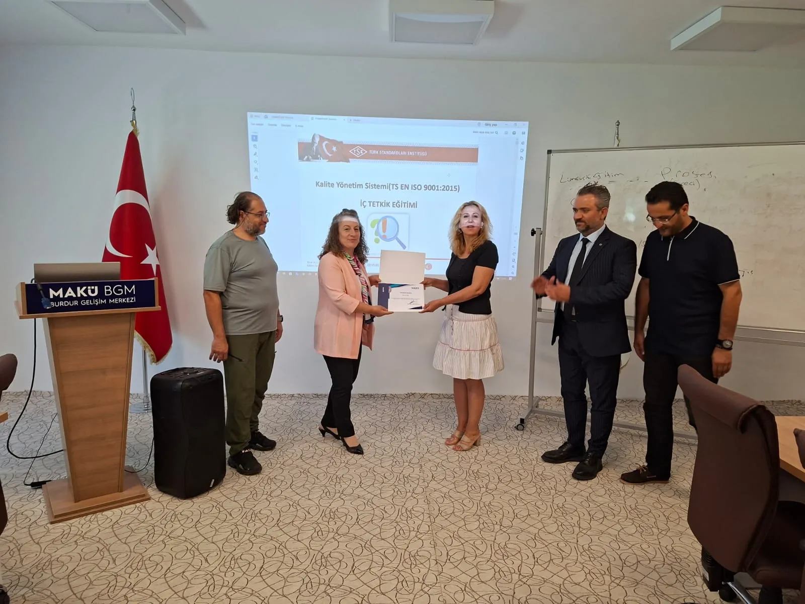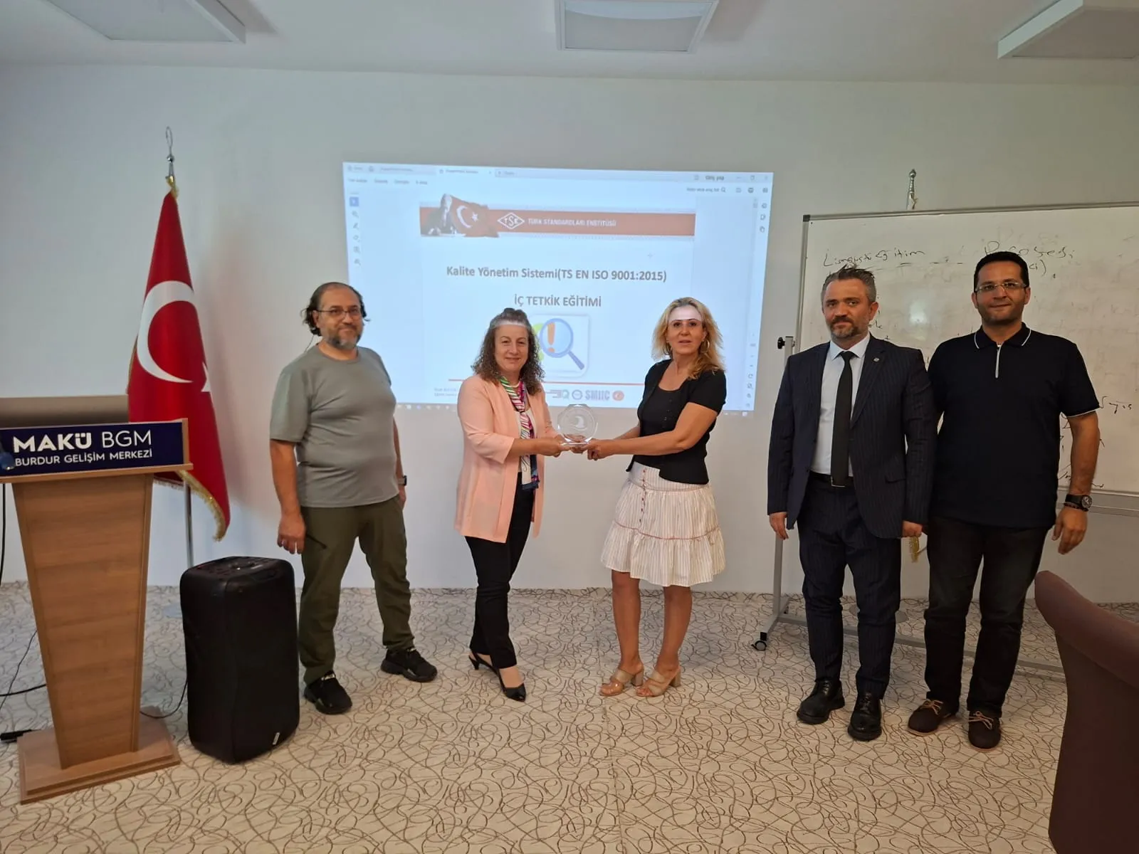 Üniversitemiz tüm Enstitülerinde kalite standartlarının etkin şekilde uygulanmasına yönelik önemli bir adım atıldı. Mehmet Akif Ersoy Üniversitesi Burdur Gelişim Merkezinde 30 Haziran - 4 Temmuz 2025 tarihleri arasında, Türk Standartları Enstitüsü (TSE) Eğitmeni ve Baş Denetçisi Ebru Bali tarafından, enstitümüz yönetici ve idari personeline yönelik beş günlük kapsamlı bir eğitim programı gerçekleştirildi. Eğitim sonunda, enstitüde görev yapan yönetici ve idari personel, iç tetkikçi olma yeterliliğini kazandı. Katılımcılar, kalite yönetimi alanında dört ayrı sertifika almaya hak kazanarak üniversitenin kalite standartlarına uyum sürecinde önemli bir yetkinlik elde etti. Eğitim sonrasında Üniversitemiz adına Prof. Dr. Perihan ÜNİVAR tarafından Eğitmen BALİ'ye Teşekkür Belgesi ve Anma takdim edildi.